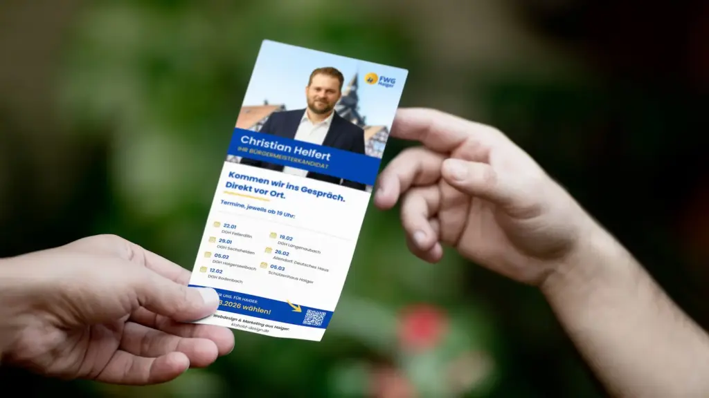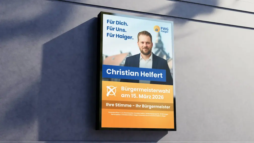 Großformatige Außenwerbung im DIN A1-Format, die den Kandidaten und seine Kernbotschaft „Für Dich. Für Uns. Für Haiger.“ präsent macht.